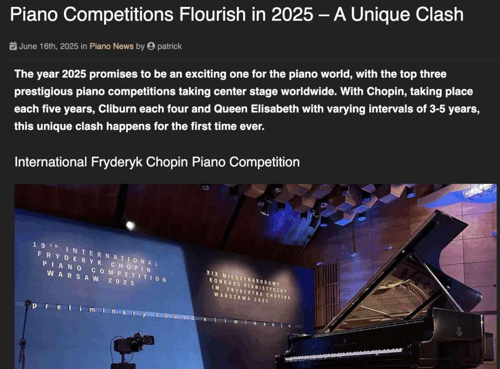 Joka viides vuosi pianomaailma suunnistaa Varsovaan, Puolaan, missä järjestetään kansainvälinen Fryderyk Chopin -pianokilpailu (Międzynarodowy Konkurs Pianistyczny im. Fryderyka Chopina). Tämä kilpailu omistautuu kokonaan yhden säveltäjän, Chopinin, tuotannolle — ei kosketa muihin säveltäjiin kuin poikkeuksellisissa tapauksissa.